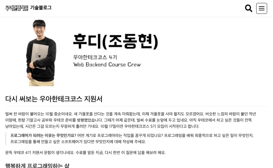 그러다 마지막 글쓰기인 주제인 '내가 꿈꾸는 프로그래머로서의 삶'의 '다시 써보는 우아한테크코스 지원서'가 다른 크루들에게 많은 투표를 받아 결국 우아한형제들 기술블로그에 등재가 되었다!