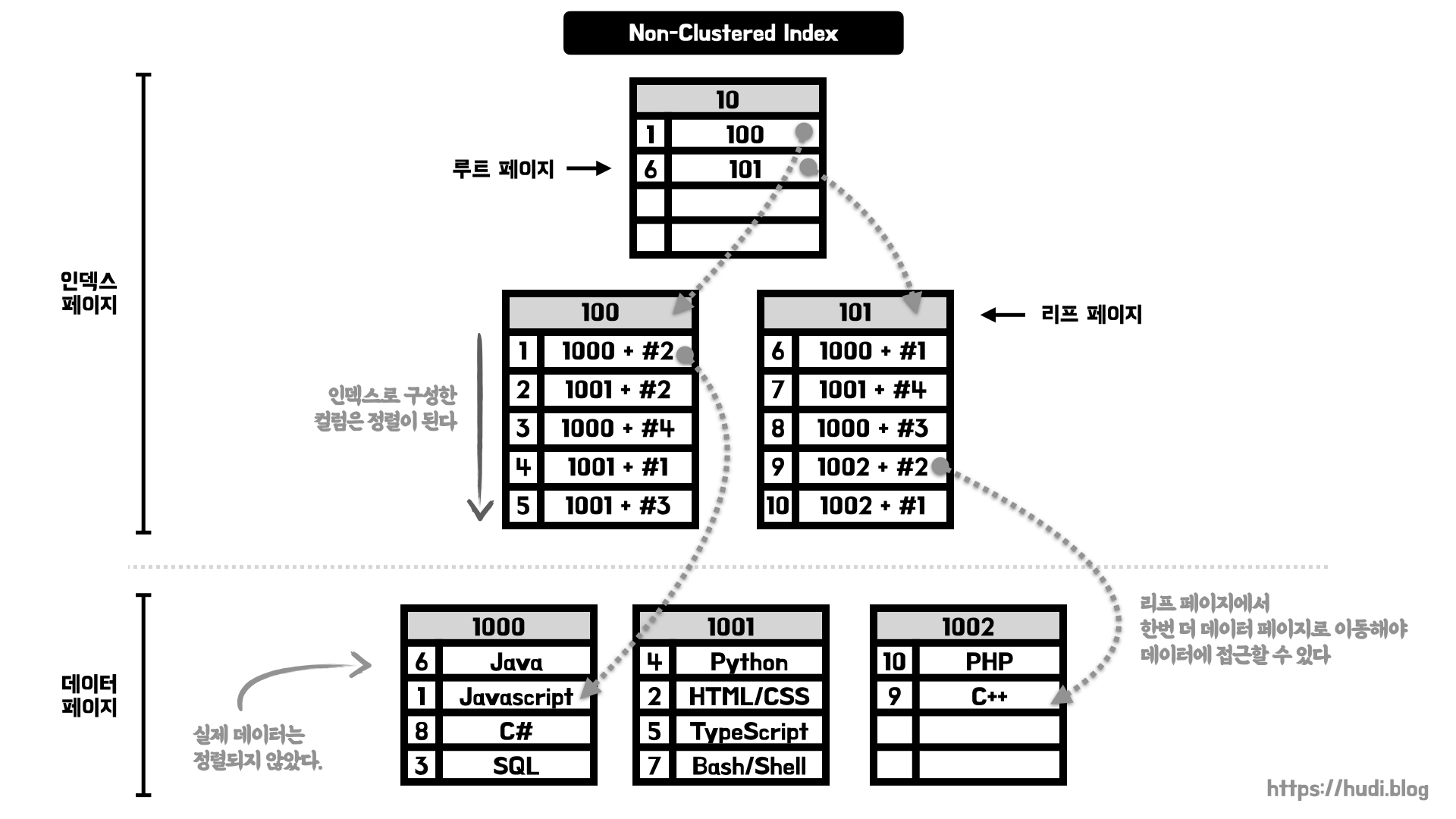 비클러스터형 인덱스는 보조 인덱스(Secondary Index)라고도 불리며, 클러스터형 인덱스와 다르게 물리적으로 테이블을 정렬하지 않는다. 그 대신 정렬된 별도의 인덱스 페이지를 생성하고 관리한다. 즉, 실제 데이터를 함께 가지고 있지 않다. 비클러스터형 인덱스는 책 뒷장의 '찾아보기' 페이지와 닮아있다.