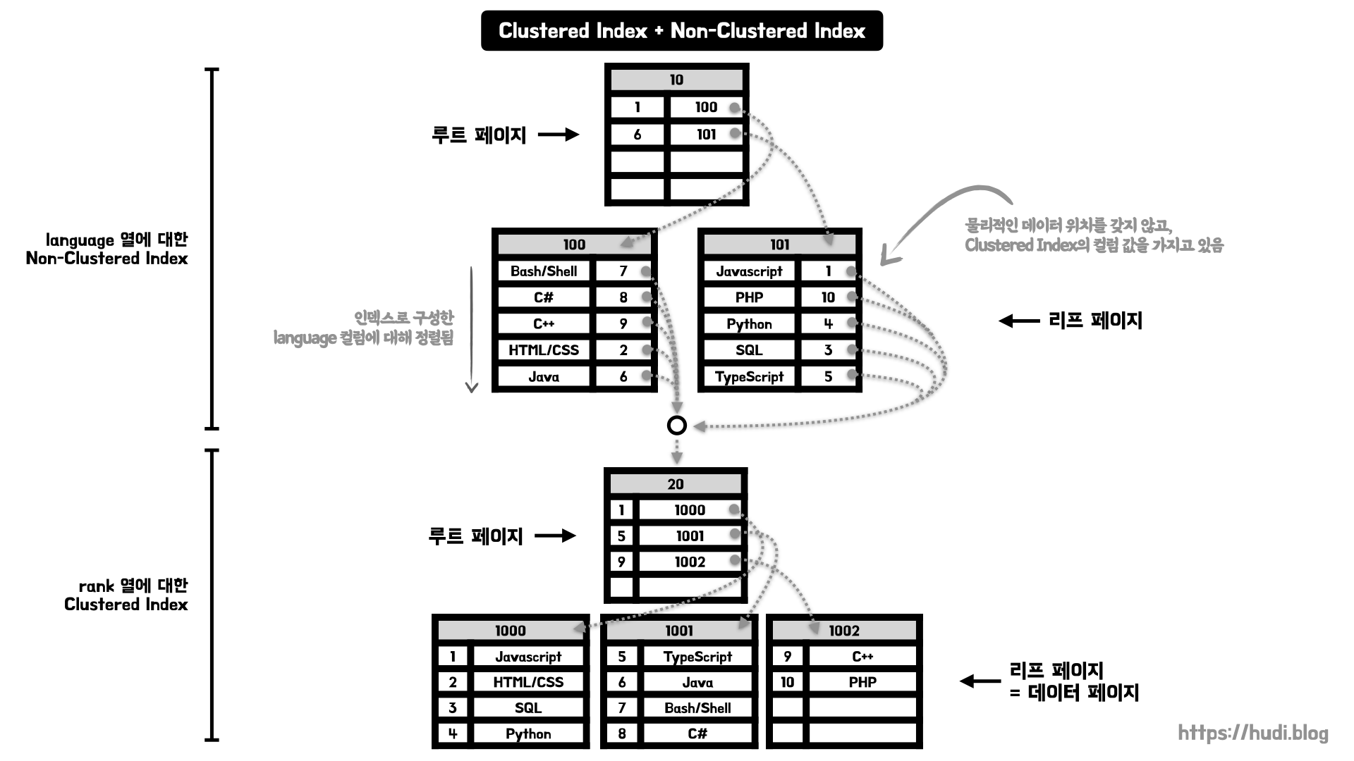 위 그림은 rank 컬럼을 PK로 지정하고, 추가로 language 컬럼에 대해 비클러스터형 인덱스를 생성한 모습이다. 비클러스터형 인덱스의 인덱스 페이지는 language 컬럼을 기준으로 잘 정렬되어 있다. 그리고 데이터 페이지 번호 + #오프셋 대신 rank 컬럼 값을 가지고 있는 것을 확인할 수 있다.