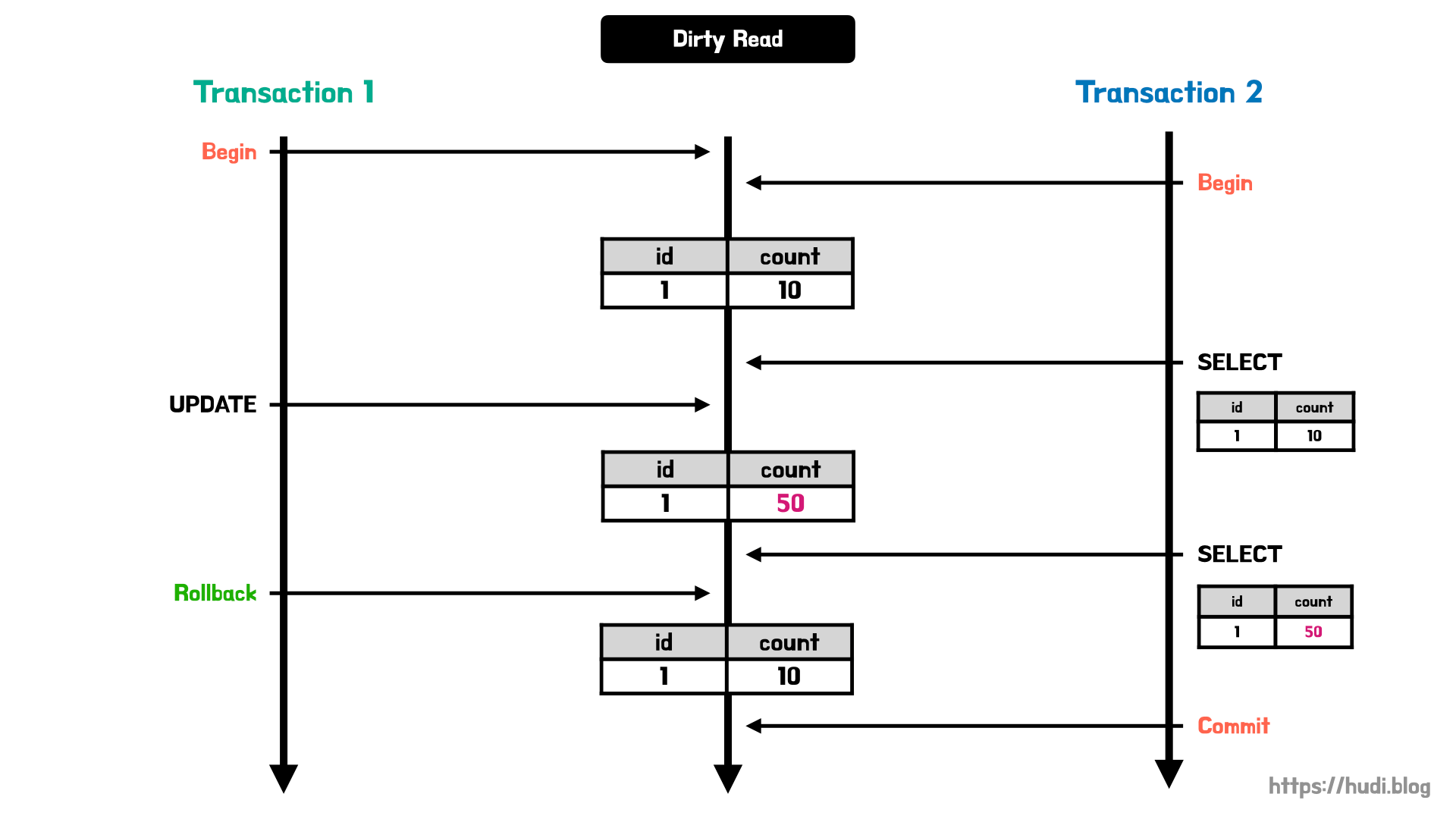 이 문제는 트랜잭션 A가 데이터를 변경하고 커밋하지 않은 시점에 트랜잭션 B가 변경된 데이터를 읽어온 상황에서, 트랜잭션 A가 변경 내용을 커밋하지 않고 롤백한 상황에서 치명적이다. 트랜잭션 B는 무효가 된 값을 읽고 처리하므로 문제가 발생한다.