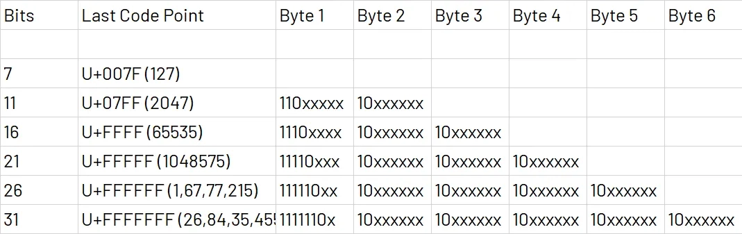 문자를 표현하는데 2바이트 이상 사용되는 경우, 아래 표 처럼 첫번째 바이트에 총 몇바이트를 사용하는지 알리는 비트를 먼저 넣는다 (2바이트는 110, 3바이트는 1110, 4바이트는 11110). 그리고 이후 바이트는 10으로 시작된다.