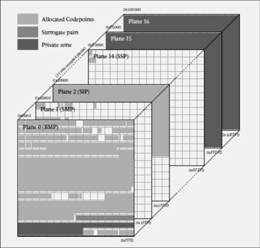 유니코드에는 유니코드 문자를 특정 범위로 묶어낸 단위인 유니코드 평면과 유니코드 영역이 존재한다. 유니코드 평면과 유니코드 영역에 대한 자세한 정보와 할당된 문자들은 위키백과 유니코드 평면 과 유니코드 영역 문서에 아주 잘 정리되어 있으며, 여기서는 간략히만 설명한다.