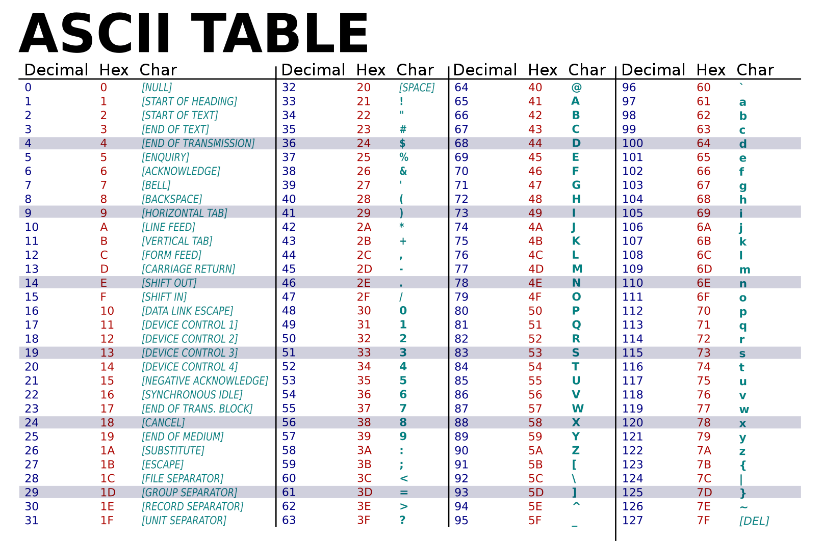 이 범위에 속하는 문자를 표현하기 위해서는 최대 7비트까지 필요로 한다. 바이트의 첫번째 비트는 0으로 표현되고, 나머지 7비트로 문자를 표현한다.