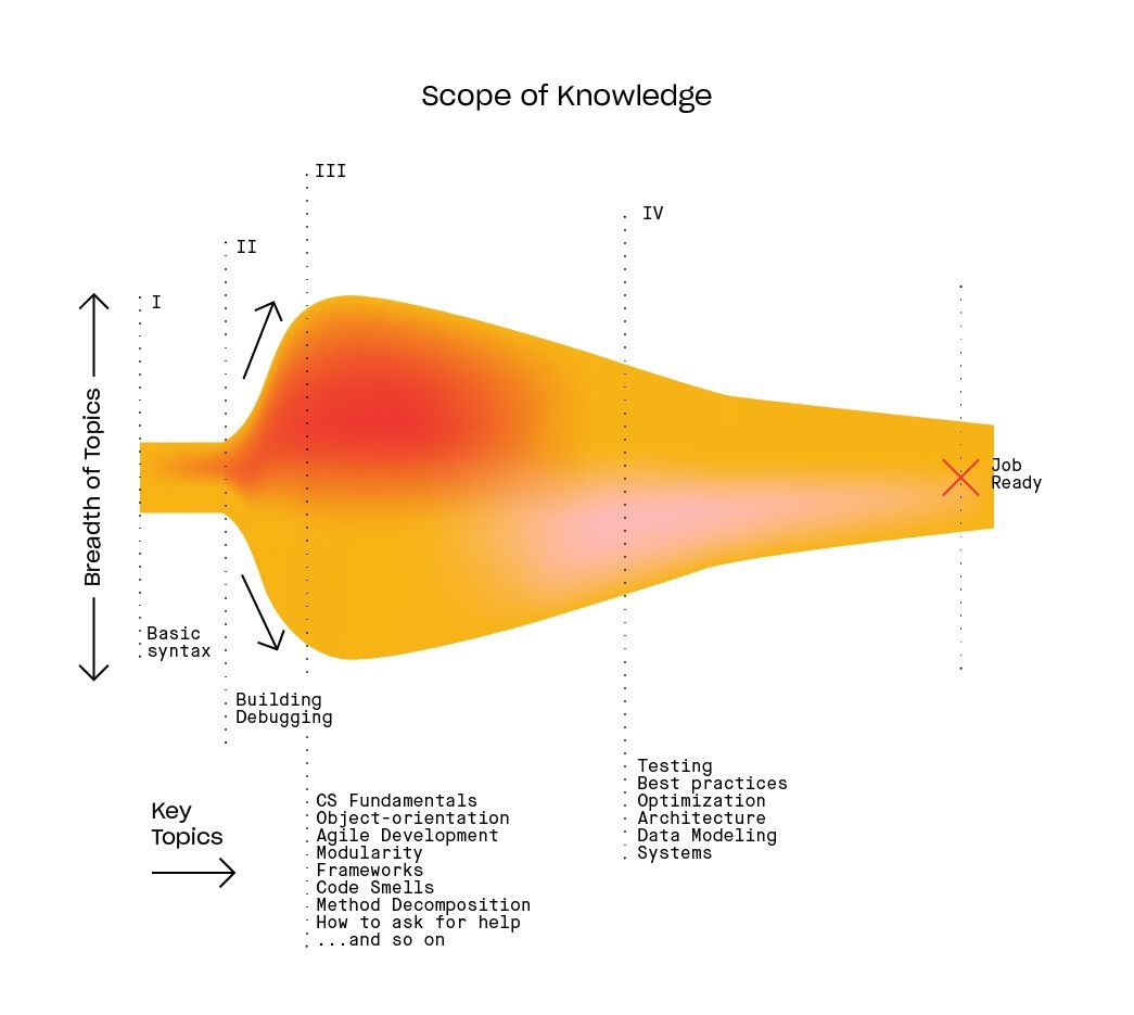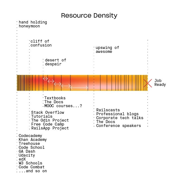 왜 코딩은 배우기 더럽게 어려울까? 위의 자료는 자료의 밀도, 아래 자료는 학습해야하는 지식의 범위이다. 왼쪽으로 갈수록 초급자, 중앙은 중급자, 오른쪽으로 갈수록 전문가라고 생각하면 된다. 보이는 것과 같이 초급자에서 중급자로 갈 수록 학습 자료의 수는 적어지고, 학습해야하는 지식의 범위는 점점 늘어난다.